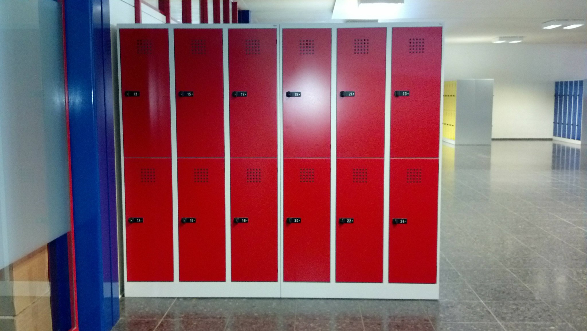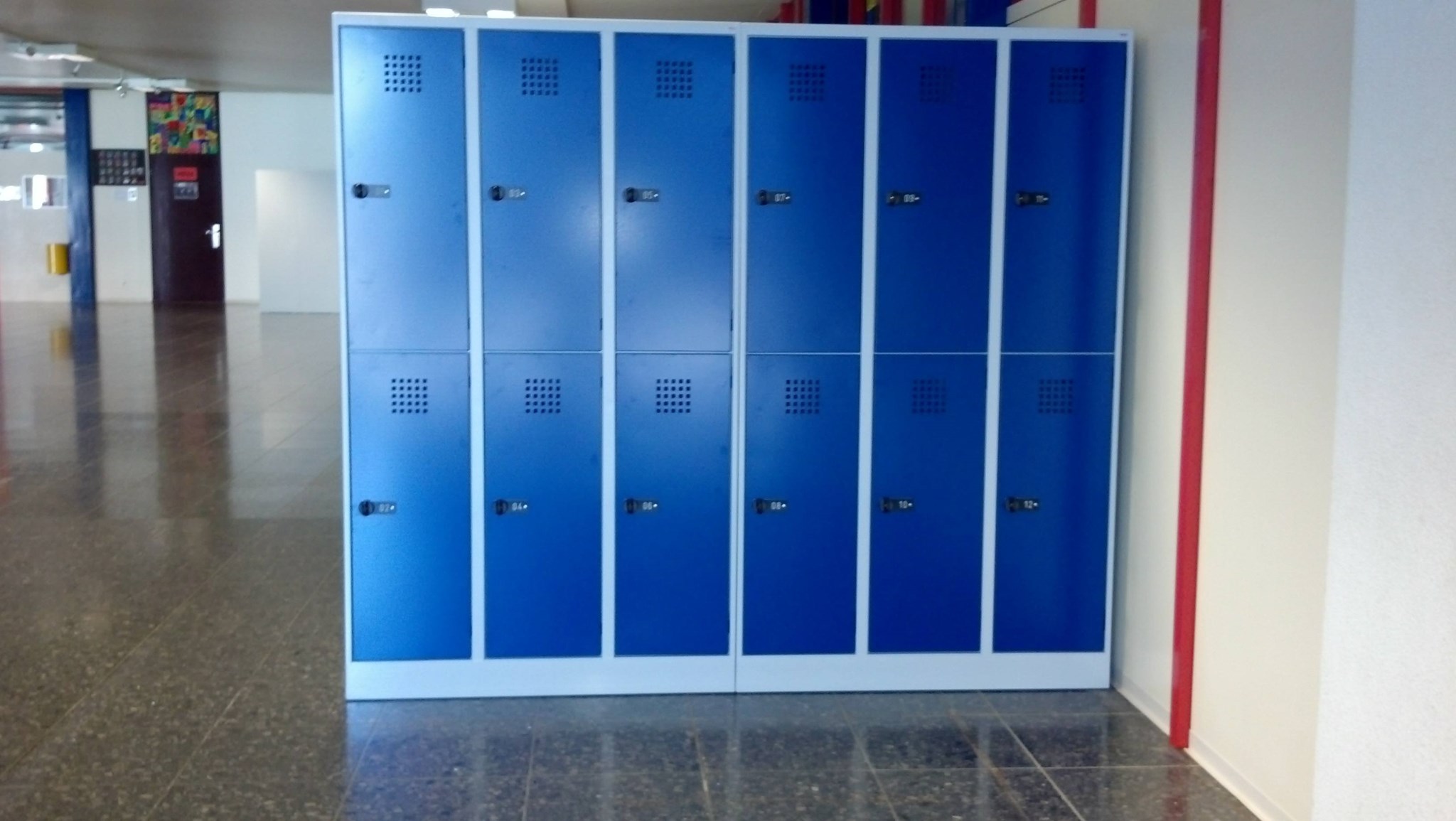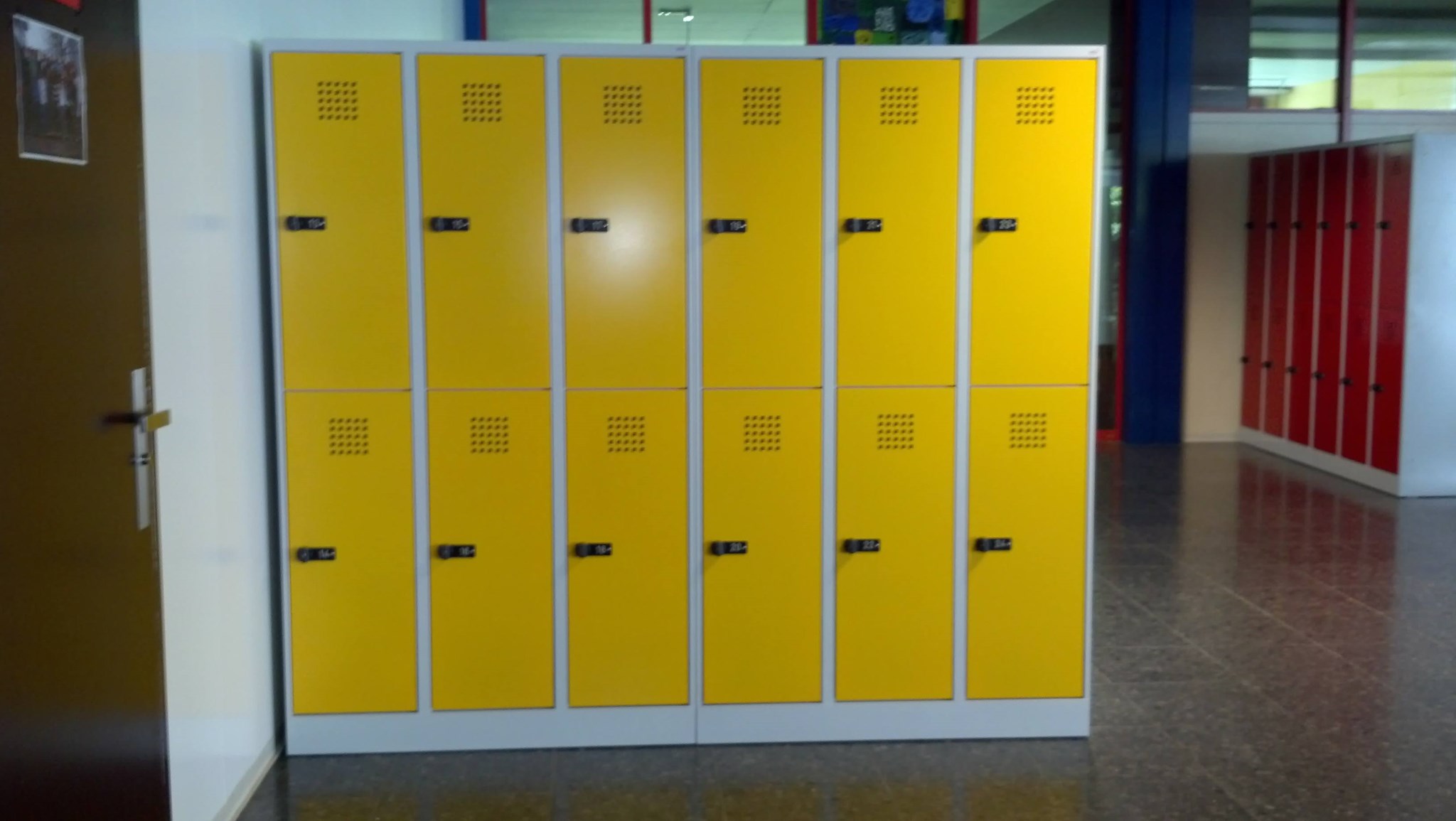Jeder Oberstufenschüler erhält ab sofort ein komfortables Garderobenfach mit Extrabreite. Durch die eingesetzten Sicherheitsdrehriegel ist auch die Aufbruchssicherheit sehr hoch. Die 3 verschiedenen Türfarben (RAL 1003 signalgelb, RAL 3000 feuerrot und RAL 5010 enzianblau) fügen sich harmonisch in die bereits in den gleichen Farben vohandene Gebäudestruktur ein. Jedes Fach verfügt über eine Kleiderstange mit 3 Haken sowie eine moderne Lüftung und ein Astralonnummernschild.