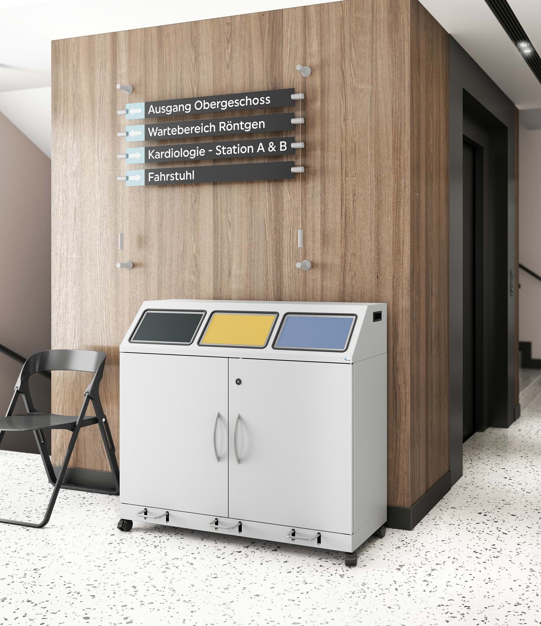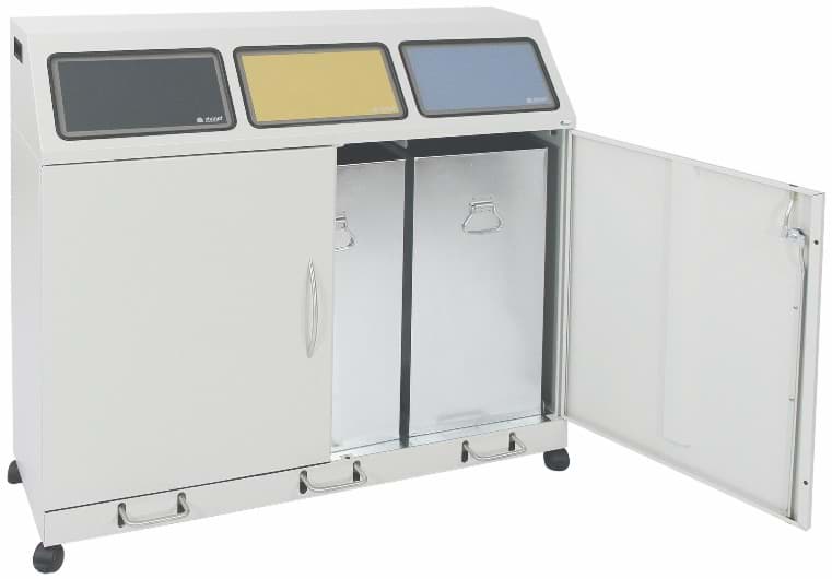 Satz Doppelrollen aus glasfaserverstärktem Polyamid, bestehend aus vier Doppelrollen (zwei davon feststellbar) und vier Aufnahmebolzen, die in vorhandene Gewinde im Behälterboden eingeschraubt werden. Farbe: schwarz, versandkostenfrei nur zusammen mit einer Abfallbehälterlieferung.