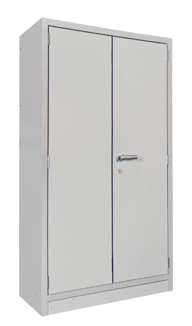 Ausstattung 4 Fachböden, 90 Minuten feuerresistent, Fachböden im Raster von 32 mm höhenverstellbar, 2-flügliger-Schrank, Türen Öffnungswinkel ca. 180°, Rauch- und Brandschutzdichtungen im Brandfall aufschäumend, Innenmasse 1768 x 980 x 407 HxBxT, 6-Punkt-Halterung je Türblatt, Verriegelung mit 3-Fallenschloss, Profilhalbzylinder, Höhe 90 mit abnehmbarer Sockelblende,