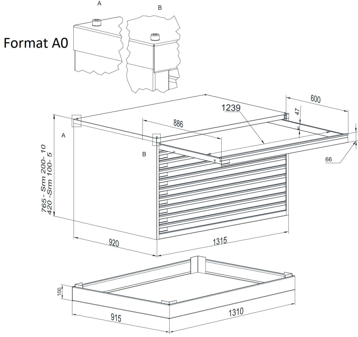 — Auf besonderen Wunsch (gegen Aufpreis) können die Schubladen (mit zusätzlichen Zwischenwänden) in verschiedene Größen unterteilt werden – von A4 bis A1.