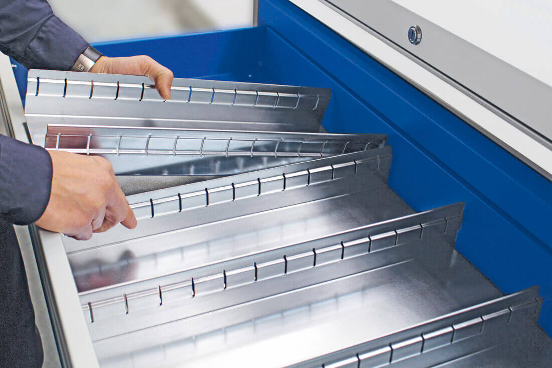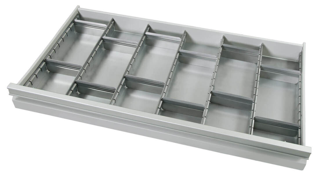 für 100 mm hohe Schubladen , Bestehend aus folgenden verzinkten Stahlelementen: 6 x Tiefenprofile Typ B1 ( je 130 mm breit) und 12 x Quertrenner Typ B1. Mit diesem Set wird die Schublade in 18 tiefenvariable, 130 mm breite Fächer unterteilt.. Nur Versandkostenfrei im Zusammenhang mit einer Schrankbestellung.