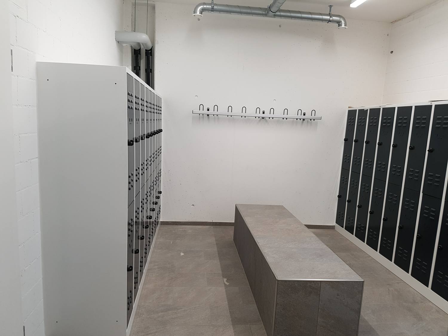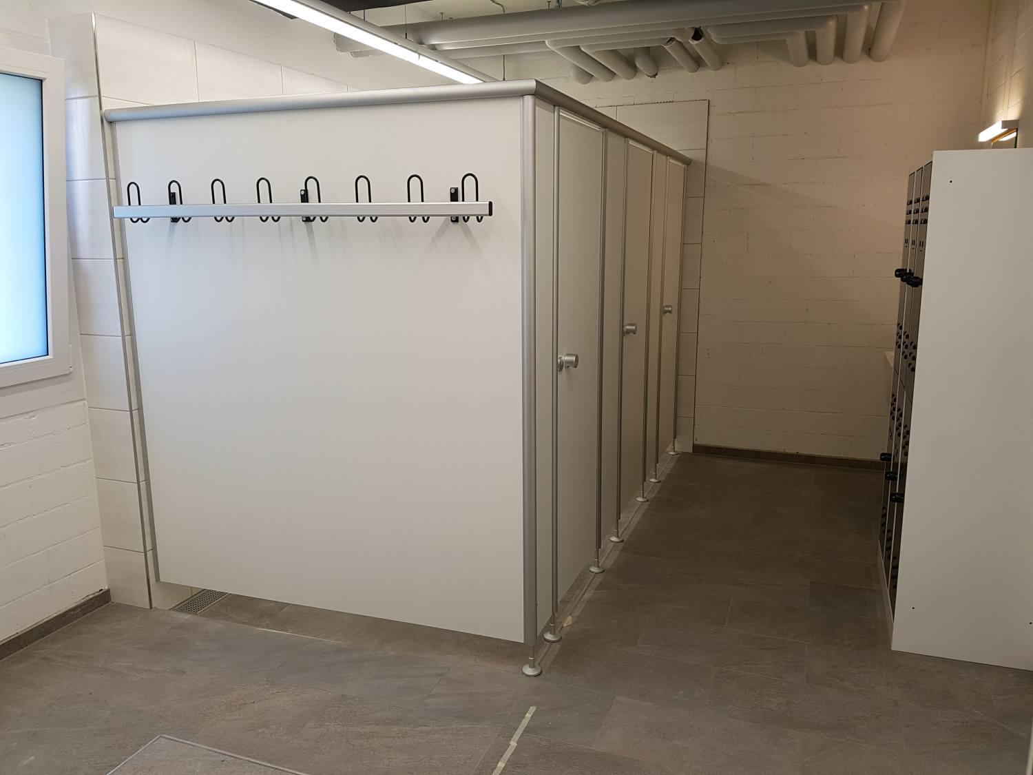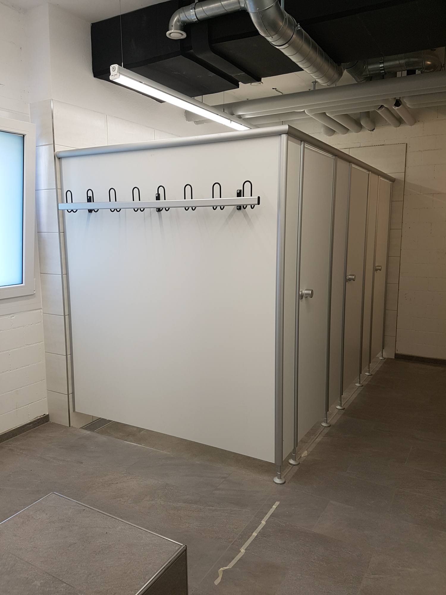 Moderne Fitnesscenter benötigen nicht nur erstklassige Trainingsgeräte sondern auch moderne und hochwertige Umkleiden. Die optisch sehr gelungen Anlage besticht durch Qualität und Funktionalität und hat diverse Extras wie die seitlich montierten Hakenleisten an den Trennwänden.