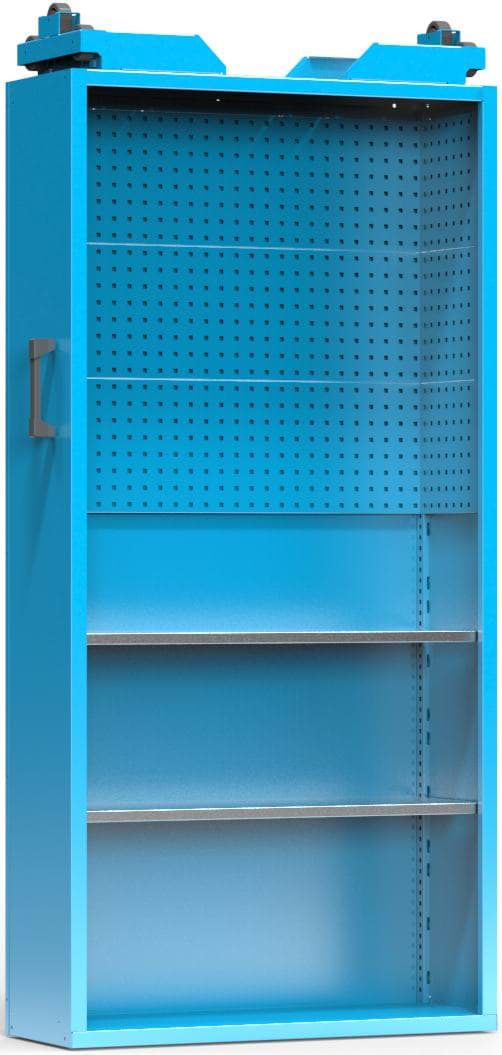 Die Schränke können mit perforierten Paneelen, Fachböden ausgestattet werden. Die Schränke können so in die Konstruktion integriert werden, dass ausreichend Platz für den Zugang zur Schranktür bleibt. An der Seitenwand der Schränke