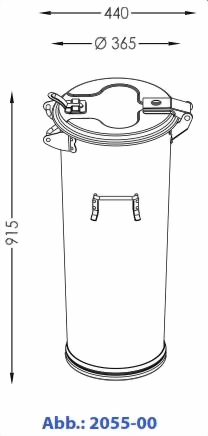 ohne Verschlussbügell, 410x440x915 mm BxTxH, 65 Liter, Behälter-Ø 387 mm, Gewicht 9.5 kg, Stahlblech 0.75 mm feuerverzinkt, Fuss 1.25 mm, Rundstahl 10 mm, Scharnierdeckel inkl. Deckelheber, 2 stabile Tragegriffe