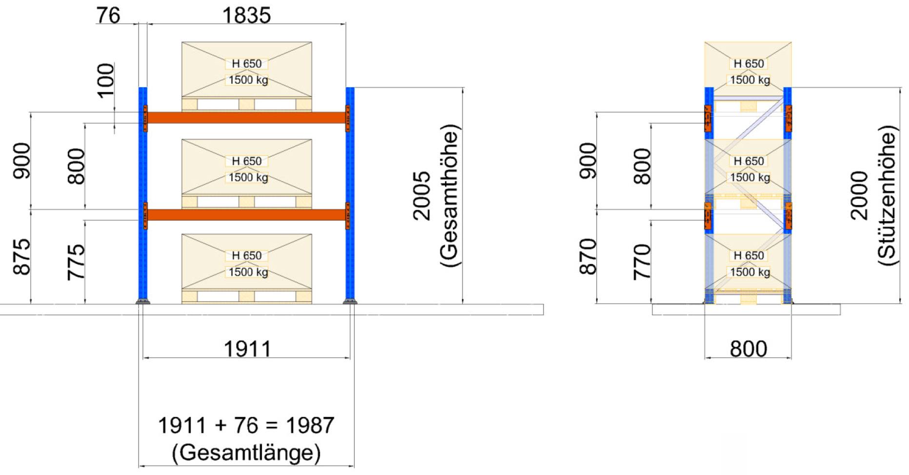 - Traglast pro Palette bei einer Auflageträgerlänge von 1825 mm 1 x 1500 kg
