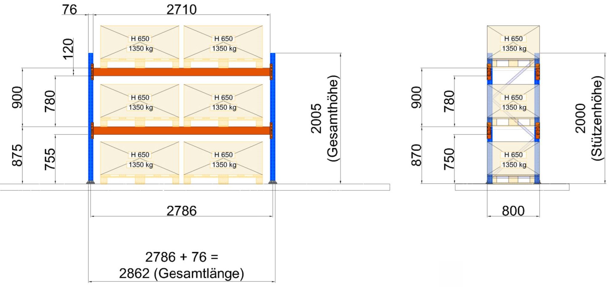 - Traglast pro Palette bei einer Auflageträgerlänge von 2700 mm 2 x 1350 kg