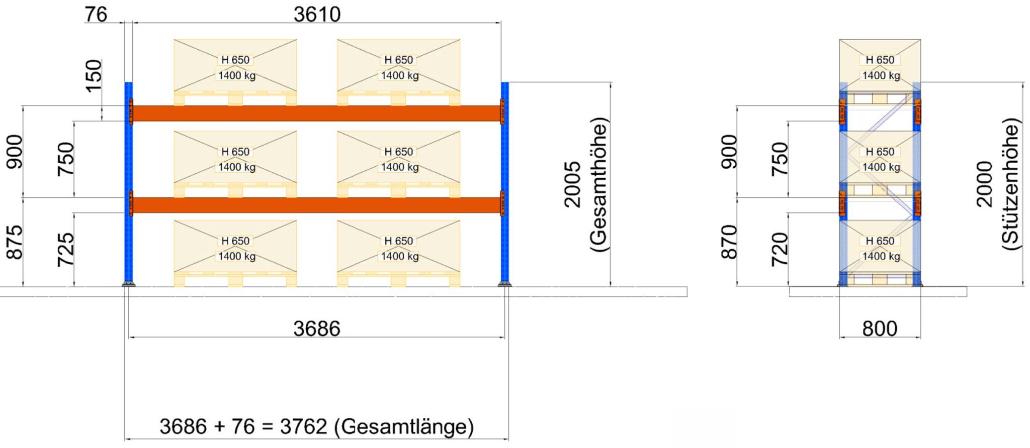 - Traglast pro Palette bei einer Auflageträgerlänge von 3600 mm 2 x 1400 kg