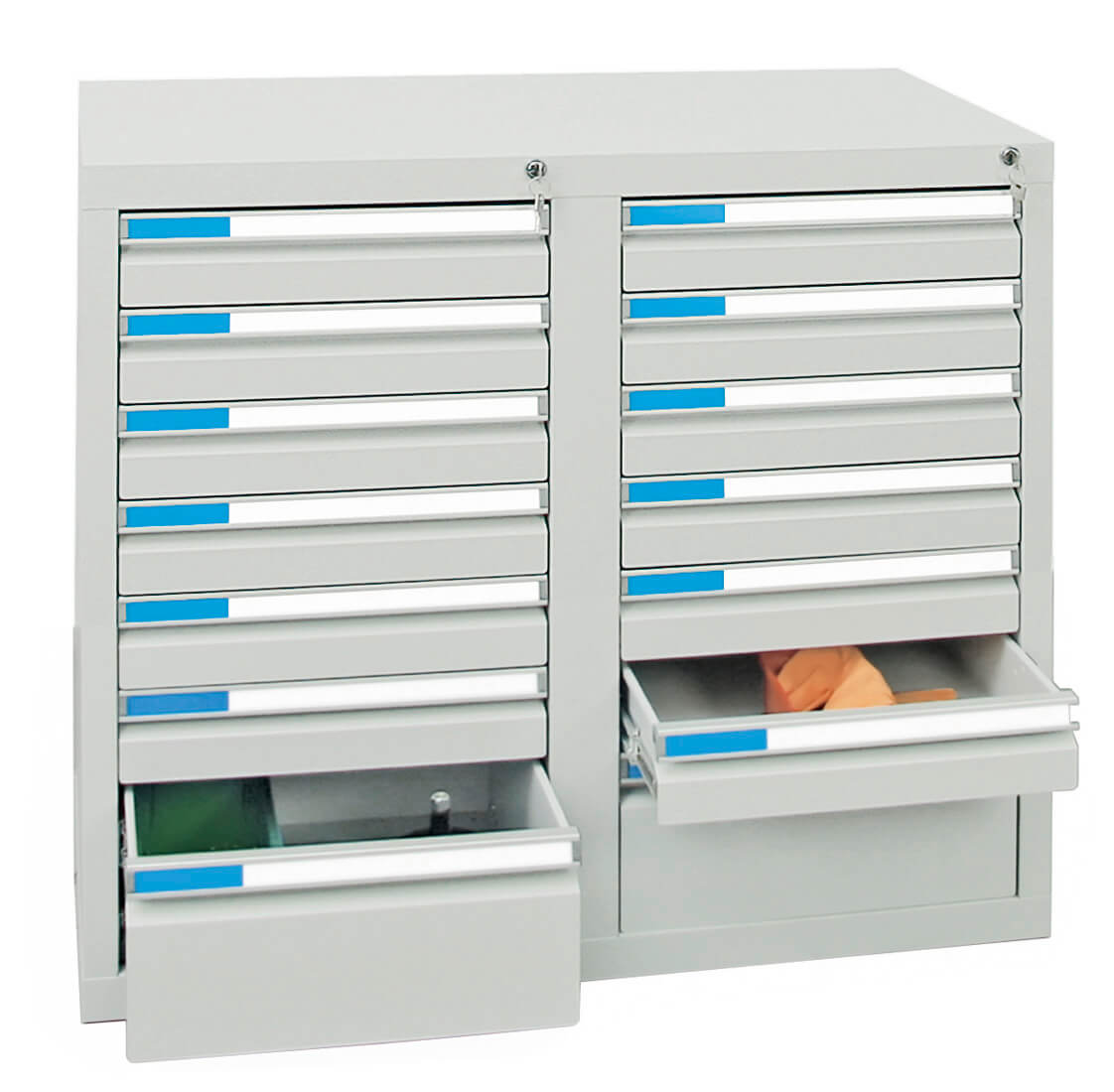 für 100 mm hohe Schubladen, Zubehör Einteilungs-Set, 1/3 verzinkt, 9-teilig, 100 mm hoch, , bestehend aus folgenden verzinkten Stahlelementen: 3 x Tiefenprofile Typ B1 ( je 130 mm breit) und 6 x Quertrenner Typ B1. Mit diesem Set wird die Schublade in 9 tiefenvariable, 130 mm breite Fächer unterteilt. Nur Versandkostenfrei im Zusammenhang mit einer Schrankbestellung.