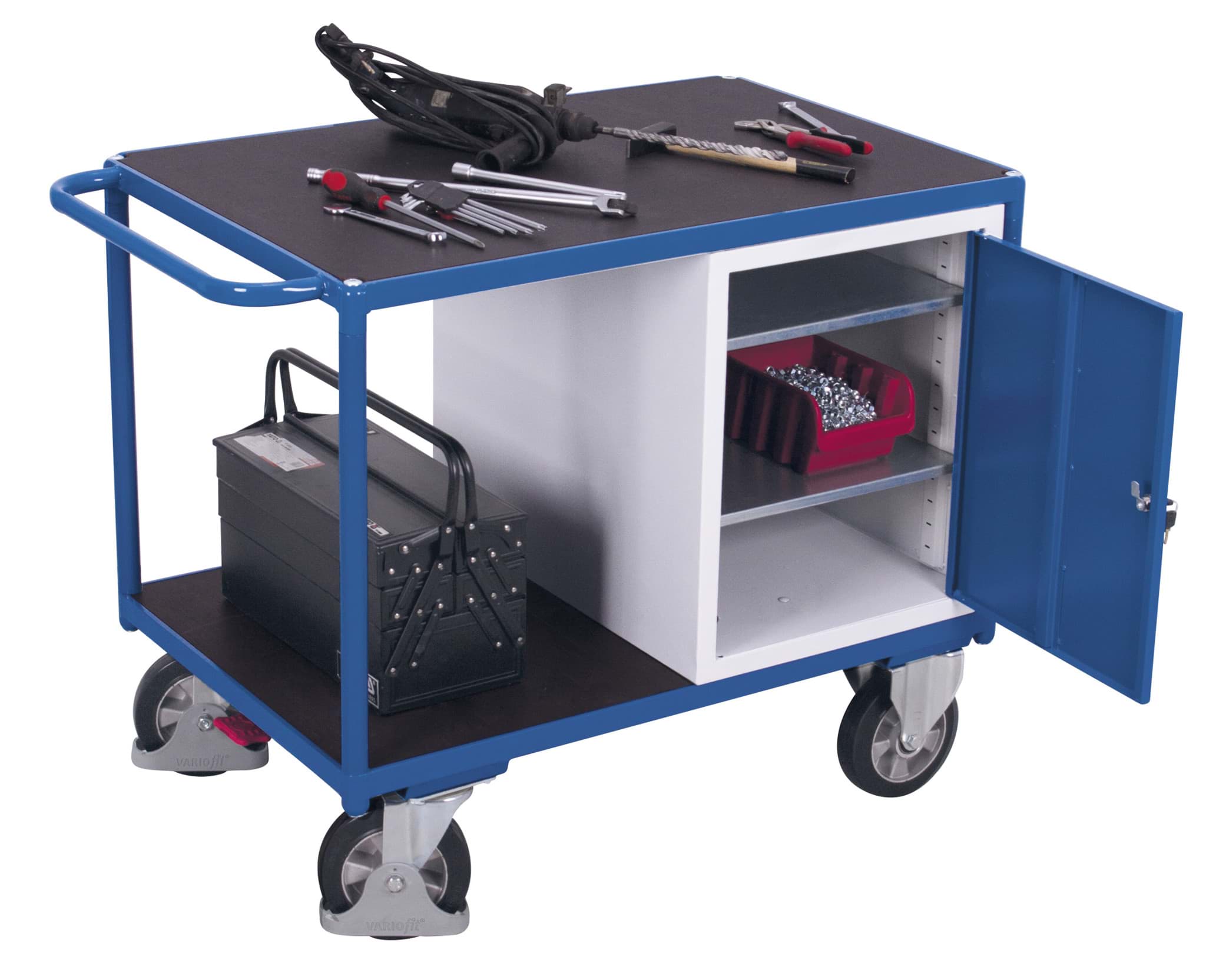 — mit Stahlschrank mit verschliessbarer Flügeltür 490 x 700 x 605 mm BxTxH incl. 1 festen und 2 verstellbaren Böden, Traglast je Schrankboden: 30 kg