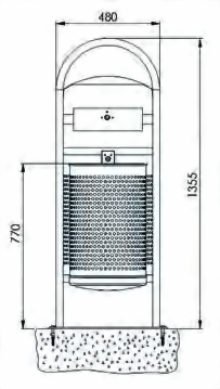 1355x480x445 mm HxBxT, Behälter 360x590 mm DxH, feuerverzinkt, Behälter 1.25 mm, Haube 3 mm, Stahlrohr D=33.7 mm, Ascher 2 mm, Rückwand 2 mm, Dreikantschlüssel, gelochter Abfallteil, gelochter Boden für Wasserablauf, Entleerung Ascher mit Klappboden