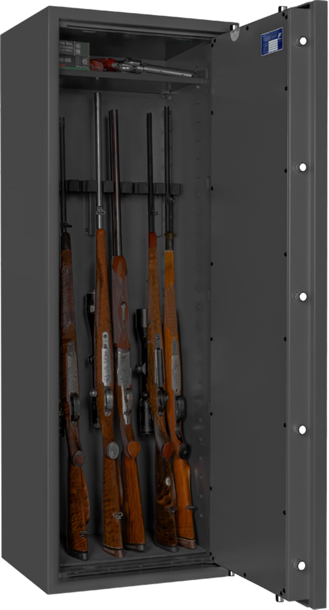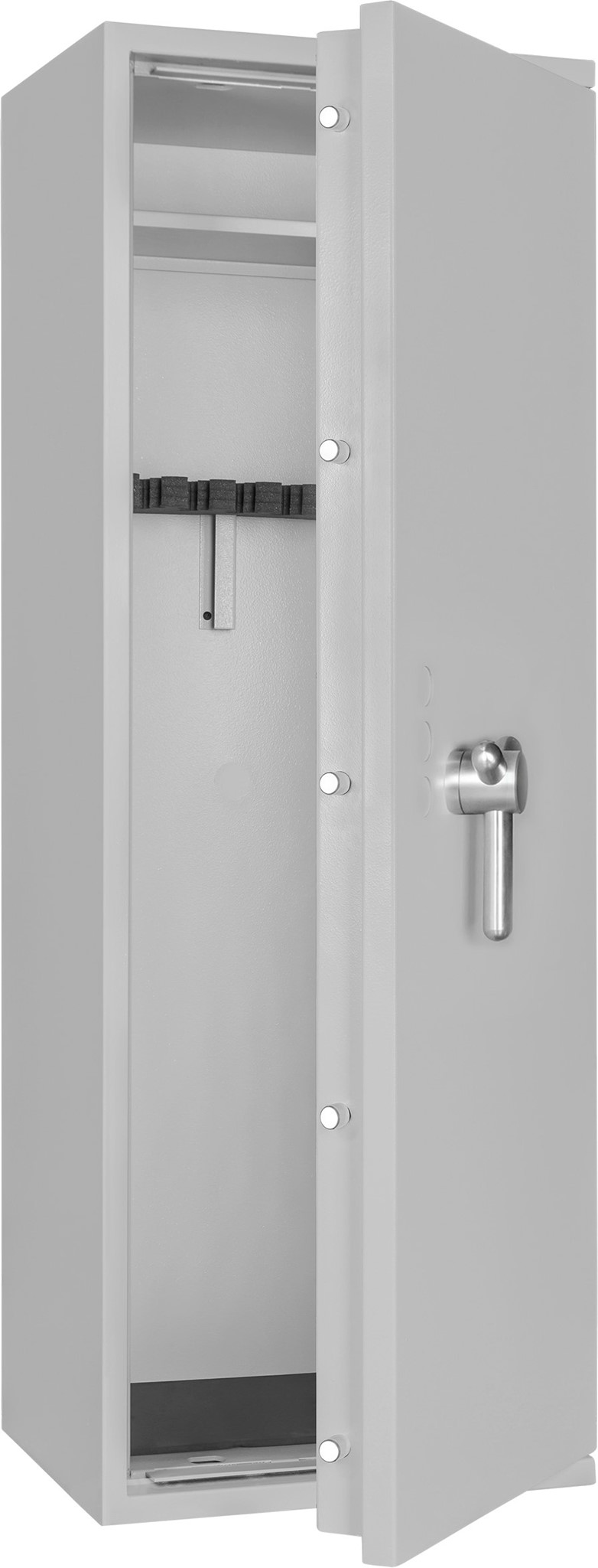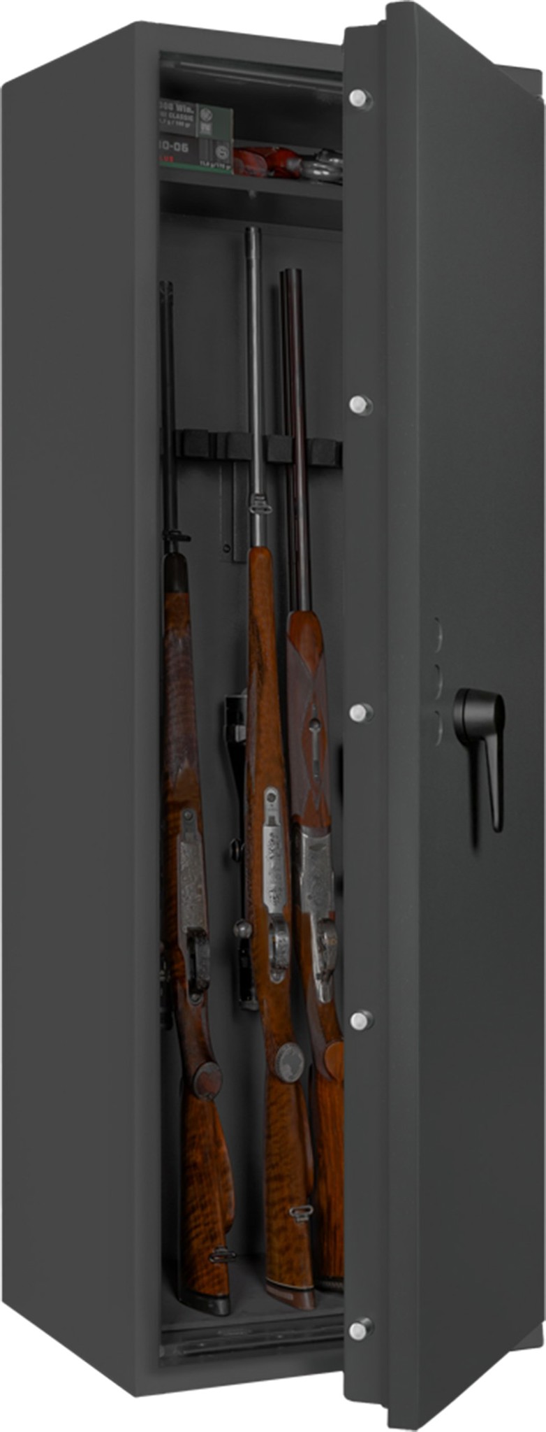 8 Waffenhalter, zertifizierter Waffenschrank gem. Wiederstandsgrad 1 nach (EN 1143-1). 1 Fachböden, 1400x500x420 mm HxBxT, Innenmasse 1320x411x305 mm HxBxT, max. Waffenlänge 1320 mm, Türanschlag DIN rechts, Langwaffenschrank mit Feuerschutz gem. DIN 4102, maximale Waffenlänge 1320 mm.