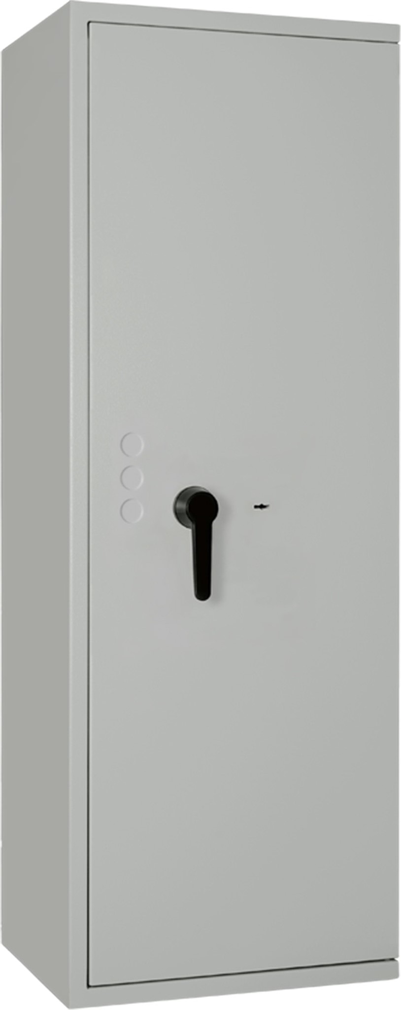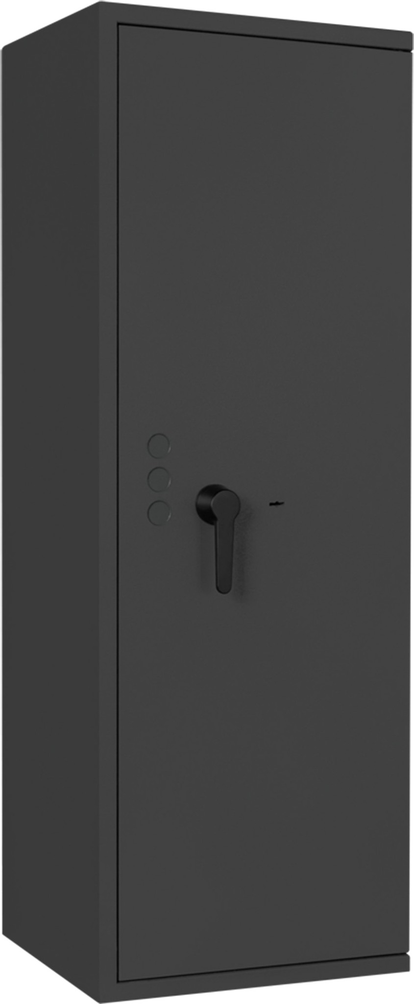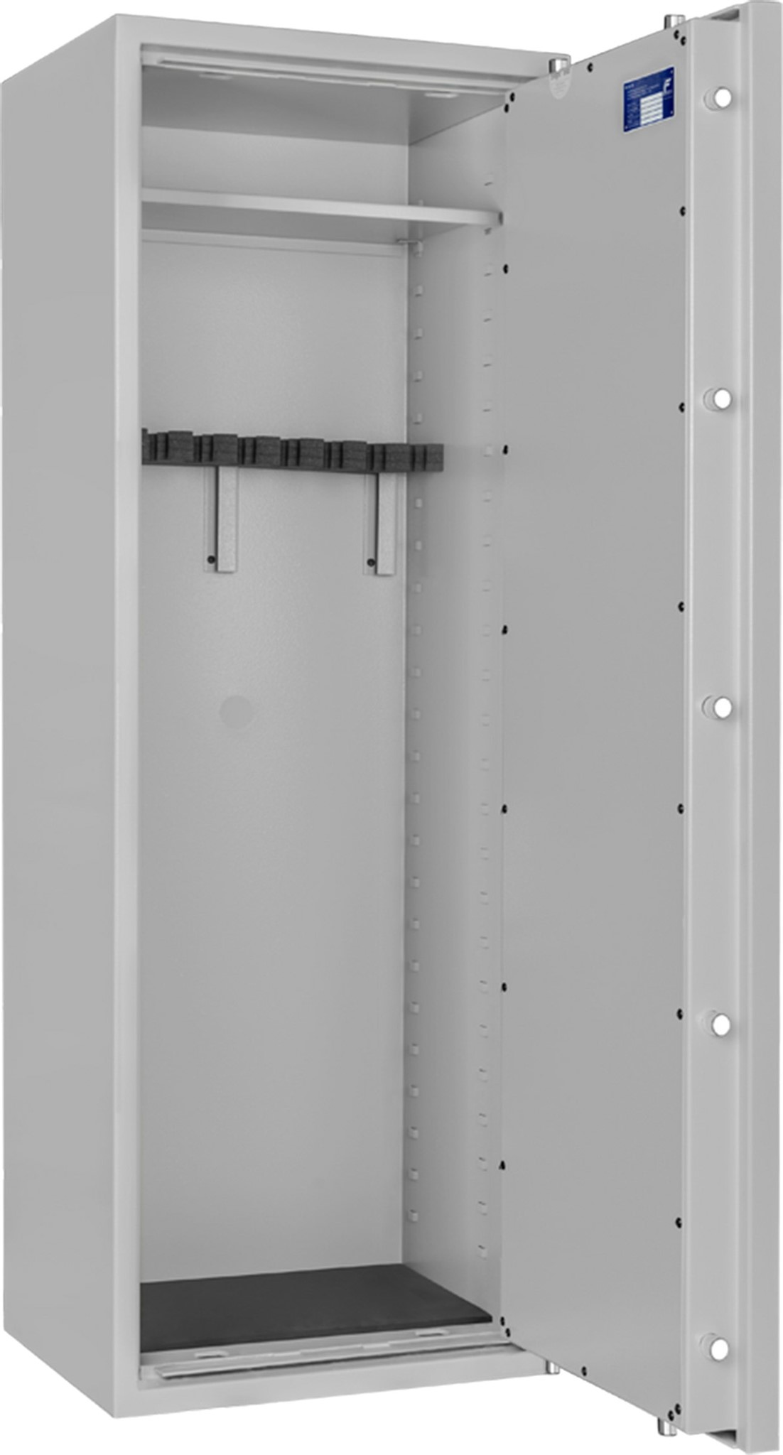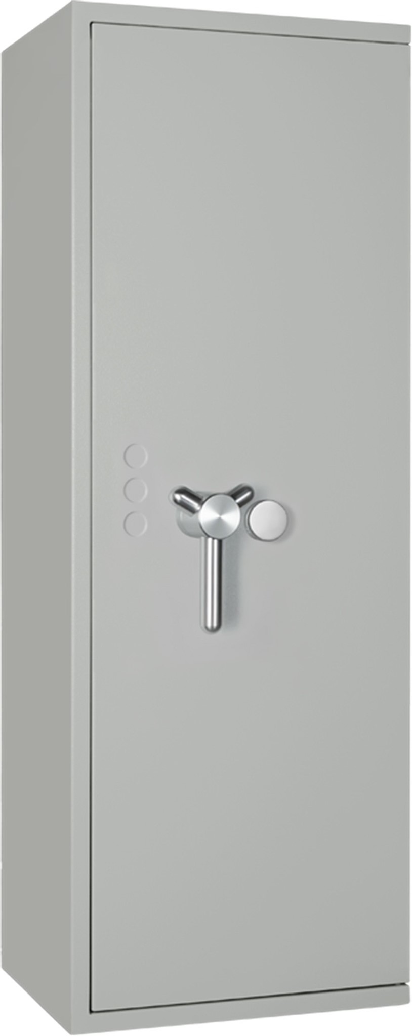 8 Waffenhalter, zertifizierter Waffenschrank gem. Wiederstandsgrad 1 nach (EN 1143-1). 1 Fachböden, 1400x500x420 mm HxBxT, Innenmasse 1320x411x305 mm HxBxT, max. Waffenlänge 1320 mm, Türanschlag DIN rechts, Langwaffenschrank mit Feuerschutz gem. DIN 4102, maximale Waffenlänge 1320 mm.
