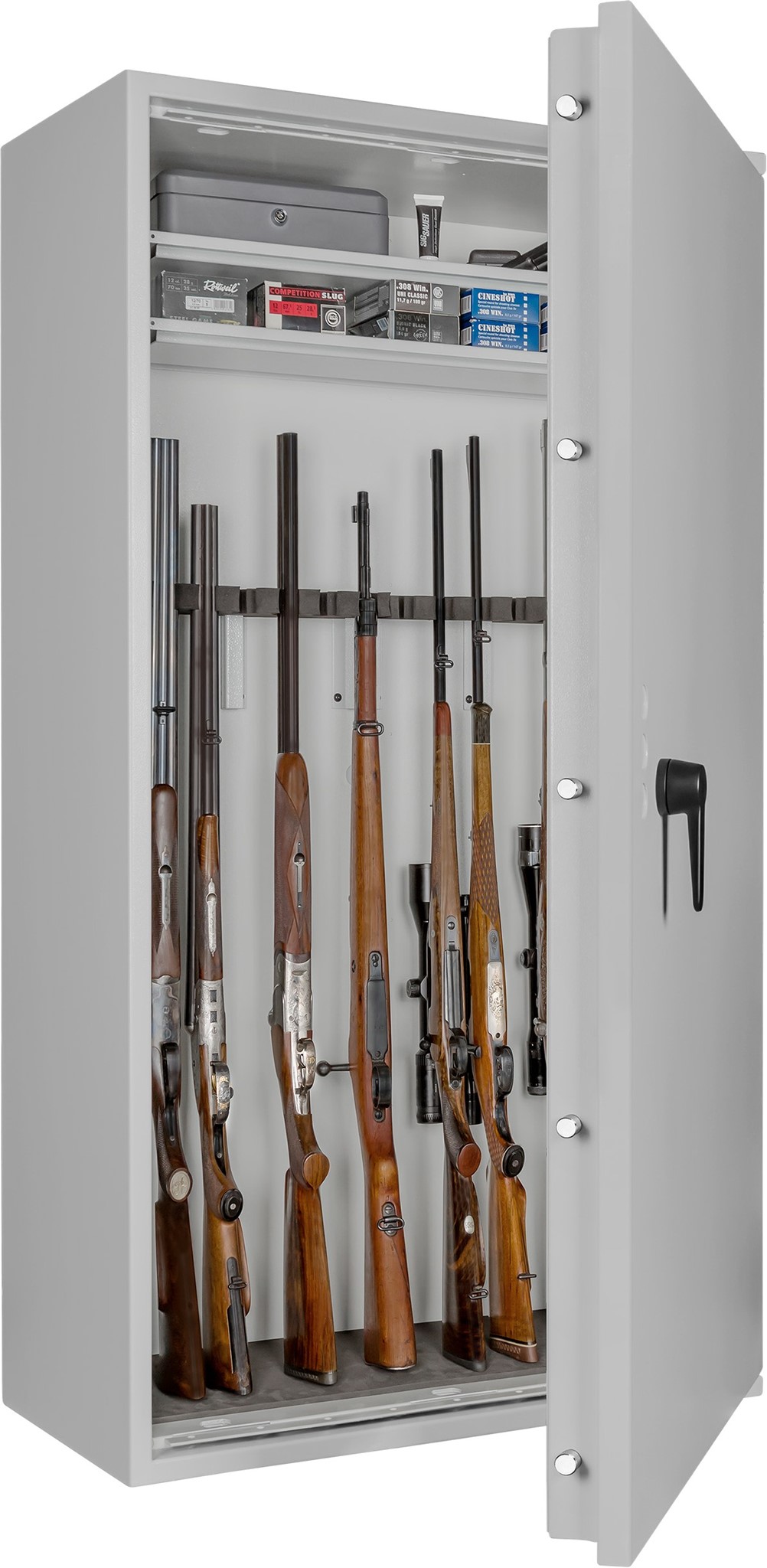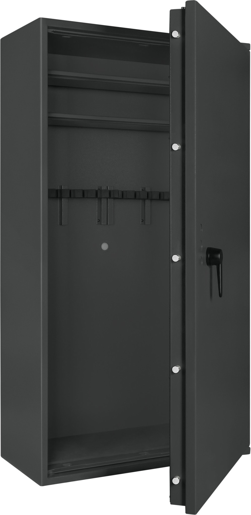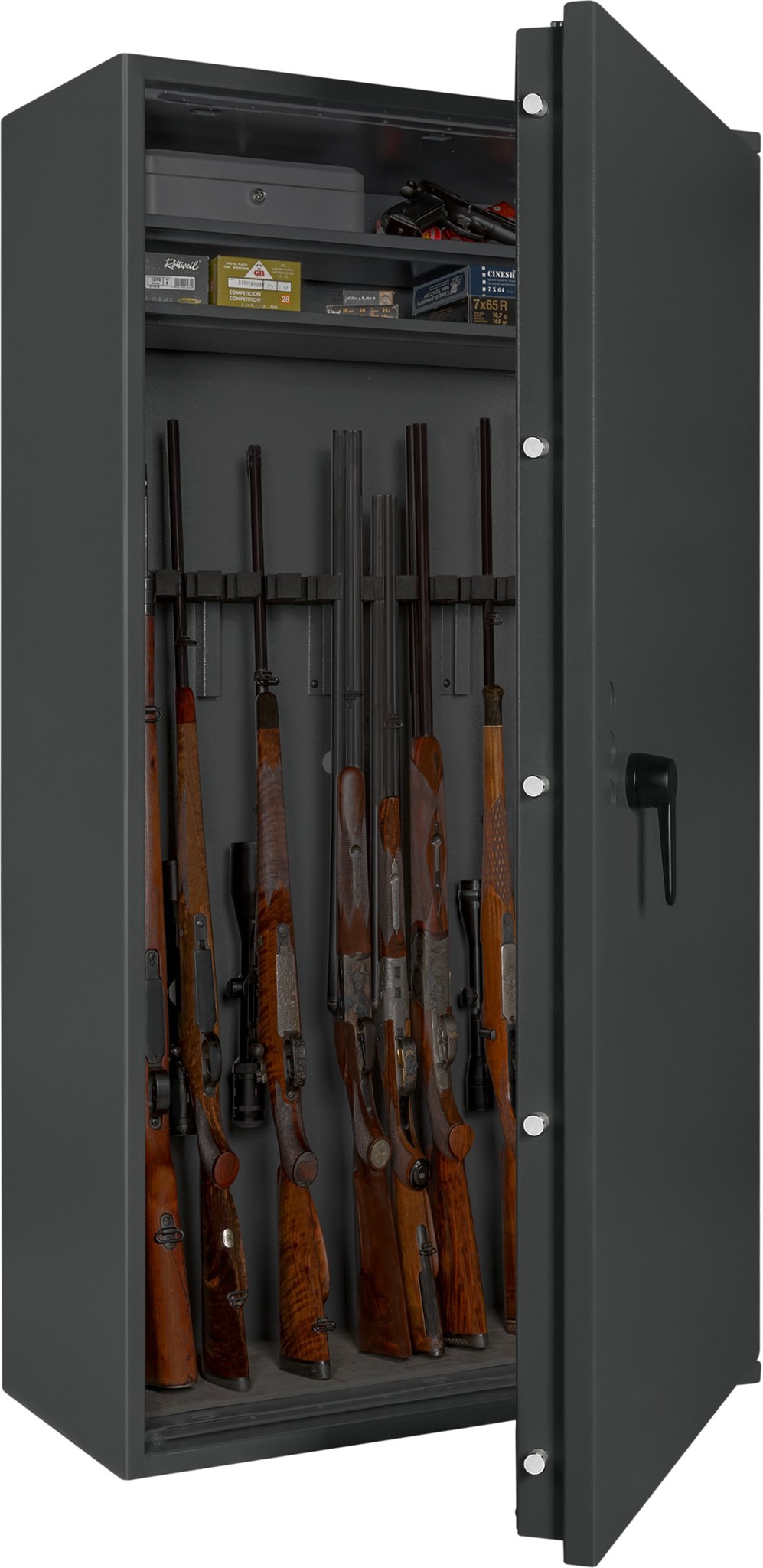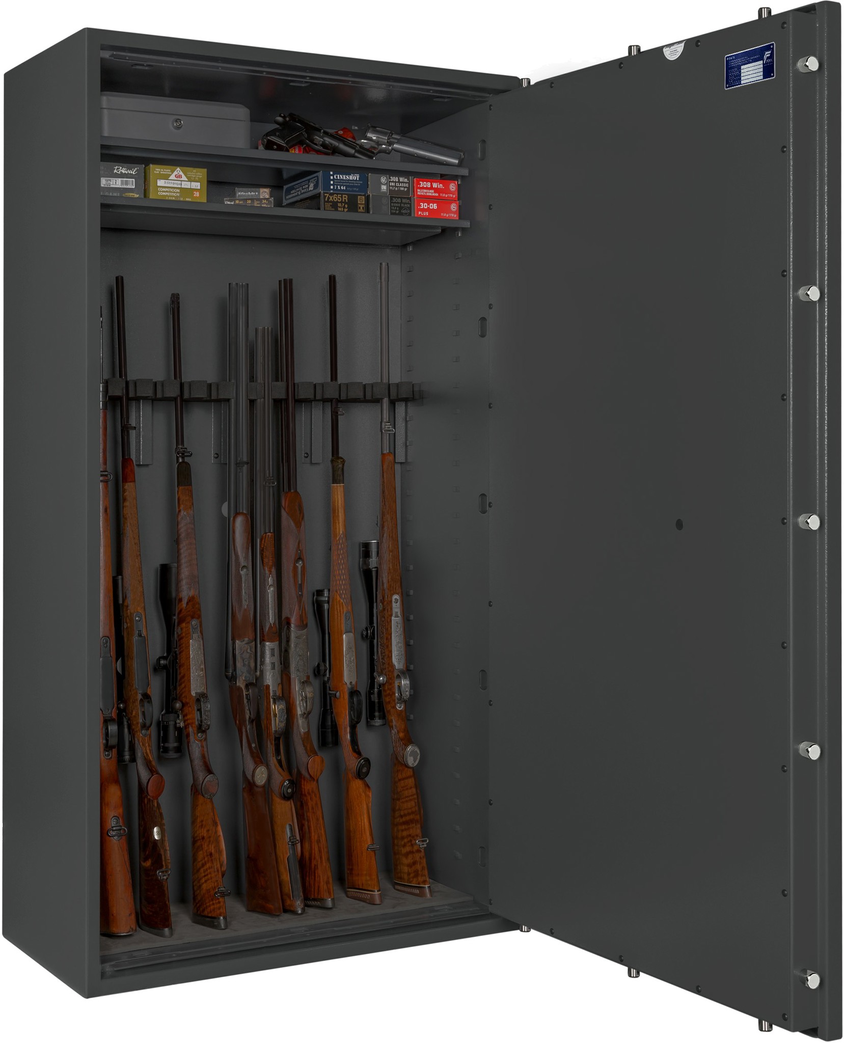 14 Waffenhalter, zertifizierter Waffenschrank gem. Wiederstandsgrad 1 nach (EN 1143-1). 2 Fachböden, 1550x850x420 mm HxBxT, Innenmasse 1470x761x305 mm HxBxT, max. Waffenlänge 1470 mm, Türanschlag DIN rechts, Langwaffenschrank mit Feuerschutz gem. DIN 4102, maximale Waffenlänge 1470 mm.