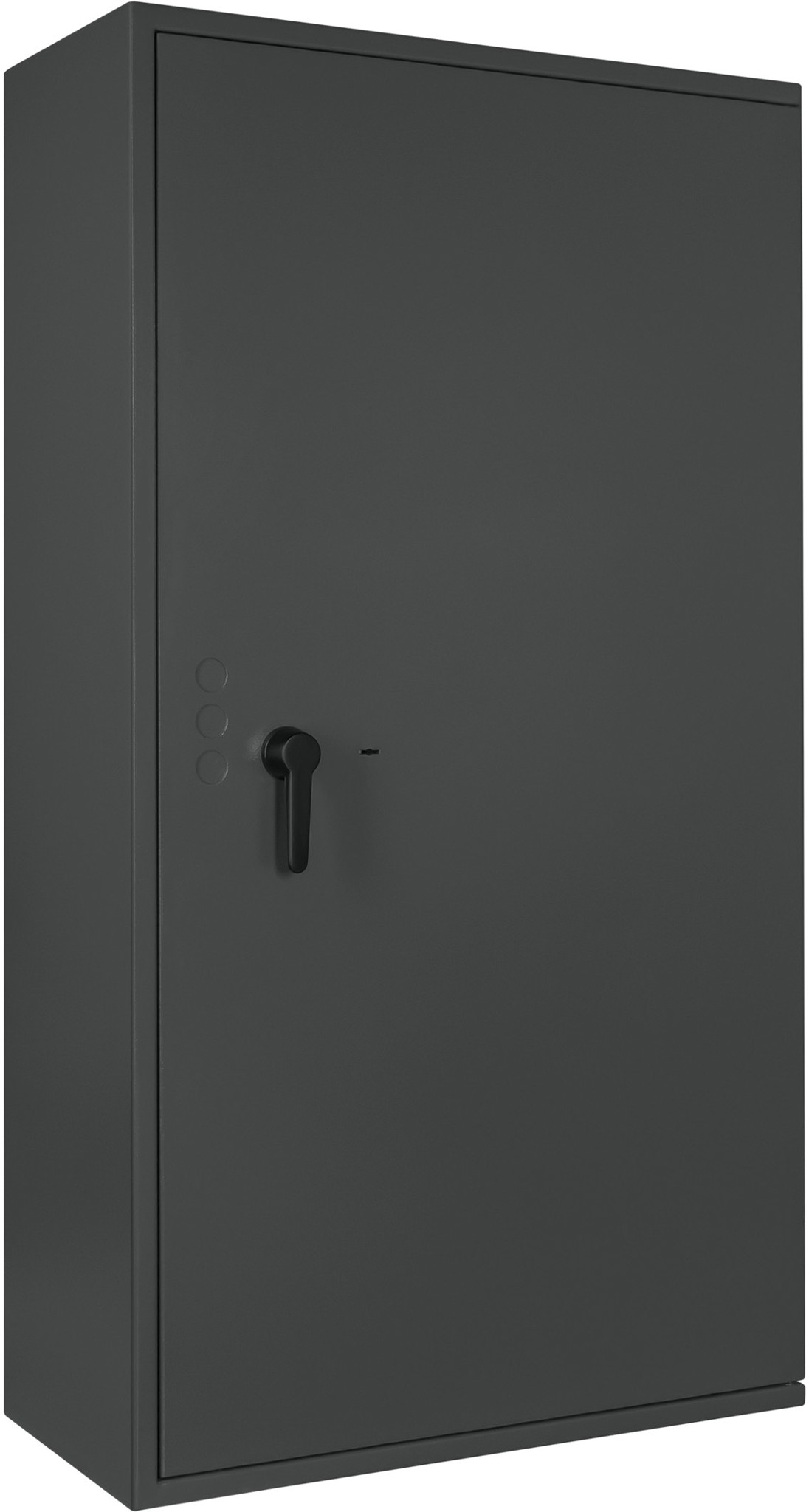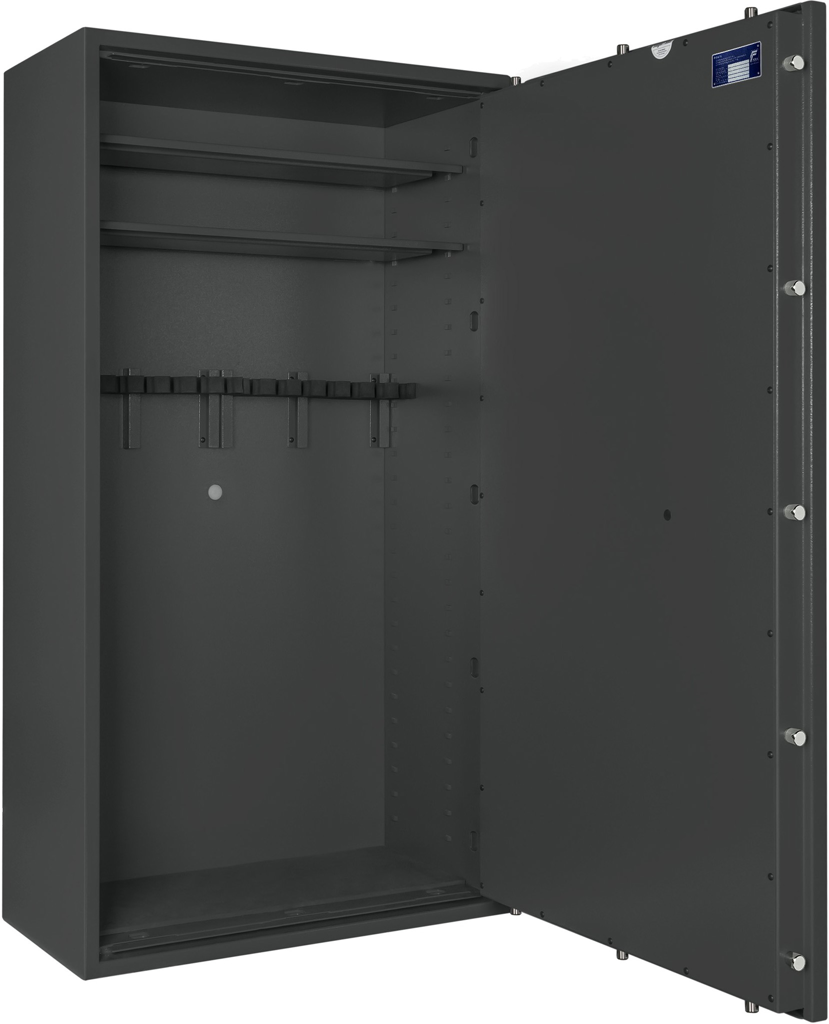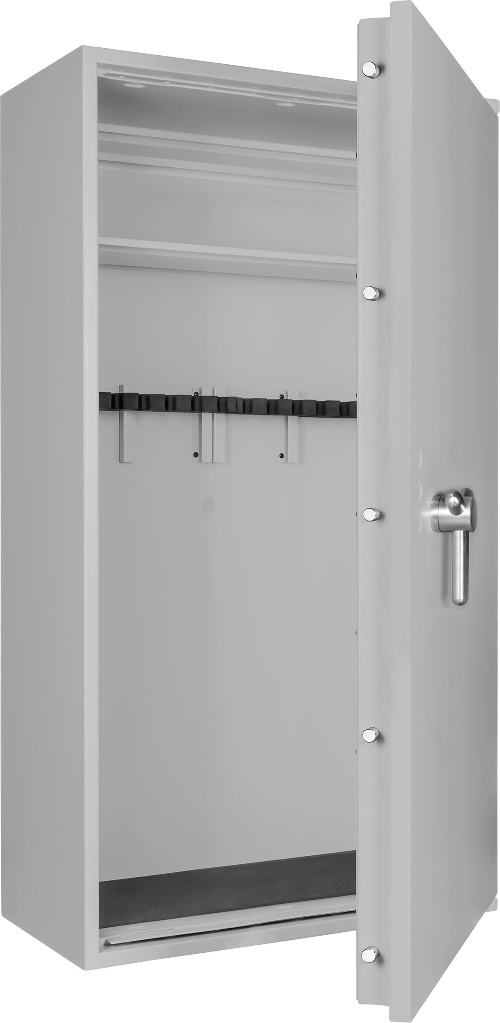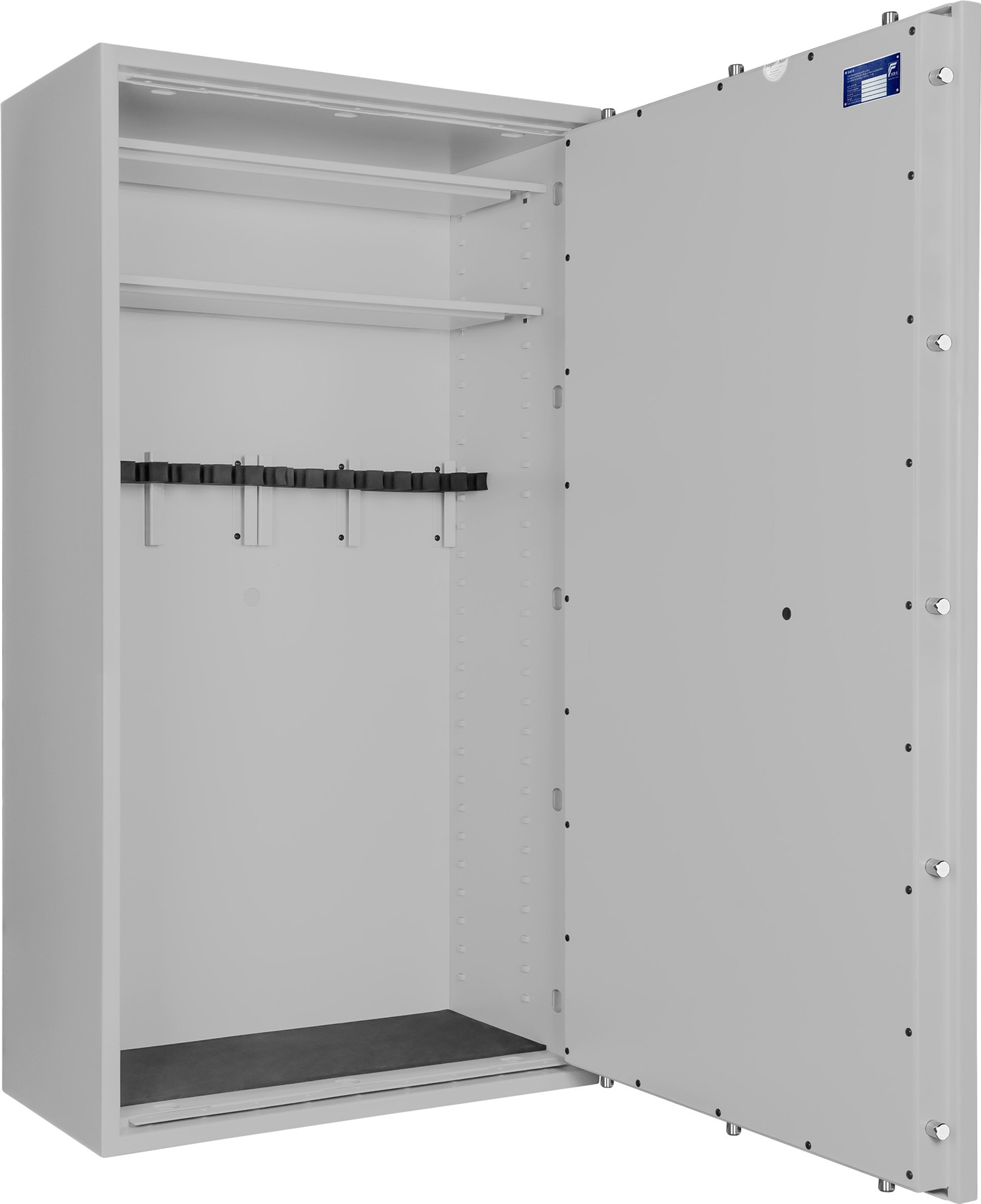 14 Waffenhalter, zertifizierter Waffenschrank gem. Wiederstandsgrad 1 nach (EN 1143-1). 2 Fachböden, 1550x850x420 mm HxBxT, Innenmasse 1470x761x305 mm HxBxT, max. Waffenlänge 1470 mm, Türanschlag DIN rechts, Langwaffenschrank mit Feuerschutz gem. DIN 4102, maximale Waffenlänge 1470 mm.
