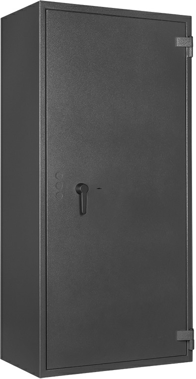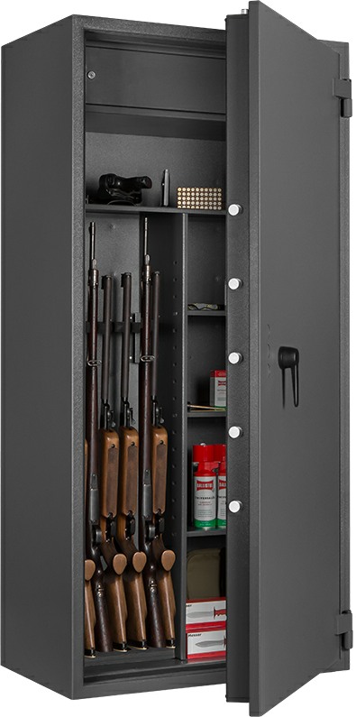7 Waffenhalter, RAL 7024 graphitgrau, 1 grosser und 3 kleine Fachboden, 1800x850x550 mm HxBxT, Innenmasse 1735x778x415 mm HxBxT, max. Waffenlänge 1496 mm, Innentresor 200x735 mm HxB, 1 Türfächer, 1 Trennwand ca. mittig, Türanschlag DIN rechts, zertifizierter Wertschutzschrank gem. Wiederstandsgrad 1 nach (EN 1143-1). Waffenschrank mit Feuerschutz gem. DIN 4102.