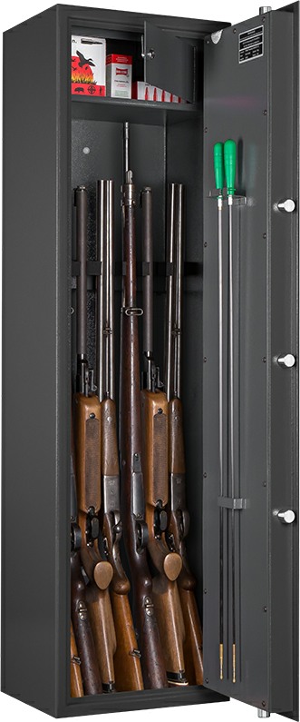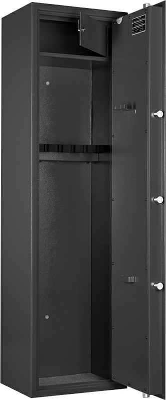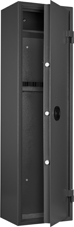 div. Schlösser/Optionen, 1450x400x335 mm HxBxT, Innenmasse 1444x394x270 mm HxBxT, max. Waffenlänge 1264 mm, 7 Waffenhalter, mit Innentresor, Türanschlag DIN rechts, zertifizierter Wertschutzschrank gem. Sicherheitsstufe S1 nach (VDMA 24 992-Ausgabe Mai 1995). Waffenschrank mit Feuerschutz gemäss DIN 4102.