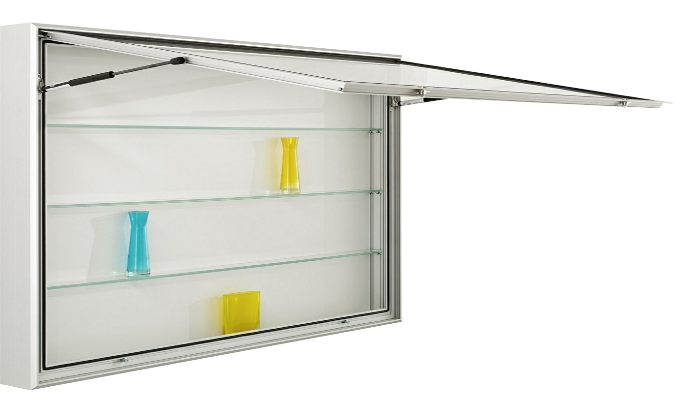 — Die Wandvitrine mit Schiebetüren kann nicht in einer Nische angebracht werden, da sich das Schloss zur Öffnung auf der Unterseite befindet.