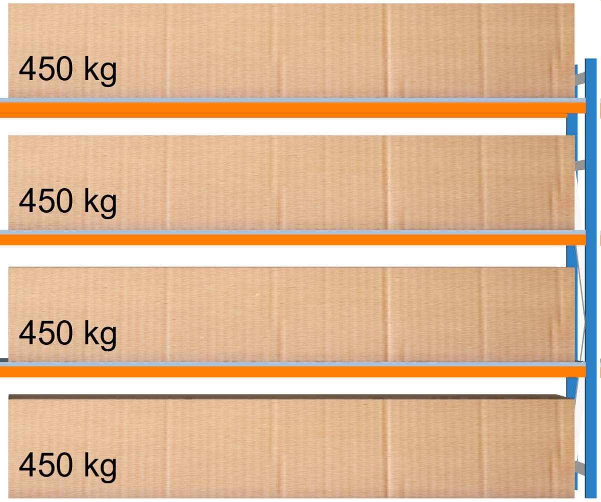 Zusatzebene mit Holzauflage für Weitspannregal GAWELA, Holzauflage 19 mm mit einer Traglast von 746 kg pro Ebene, effektive Holzmasse 2670x993 mm LxB. Eine Ebene besteht aus 2 Auflageträger Z8520 in RAL 2004 orange und einer Holzauflageplatte 19 mm sowie 3 Quer-/Tiefenauflagen TZ8520 verzinkt bei grösseren Längen oder Tiefen. Nur Versandkostenfrei im Zusammenhang mit einer Weitspannregalbestellung.