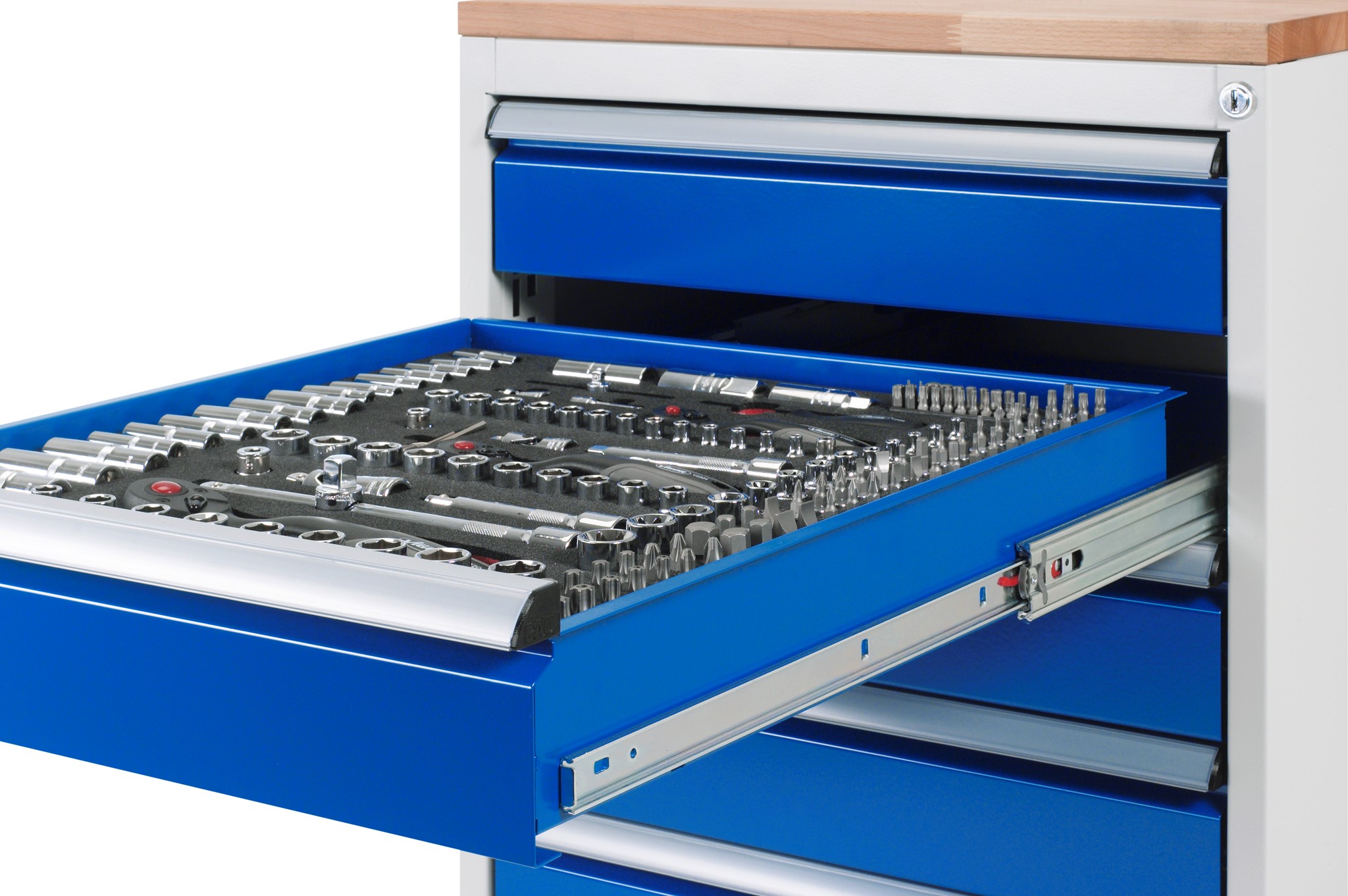 — Schublade-Grösse-XL (innen B680 x T560 mm, Tragkraft 75 kg). Die Nutzhöhe der Schublade entspricht der Fronthöhe abzgl. 15 mm. Rollengelagerte Teilauszugsschienen (Auszug 90 %) mit Selbsteinlauf und Rücklaufsicherung,