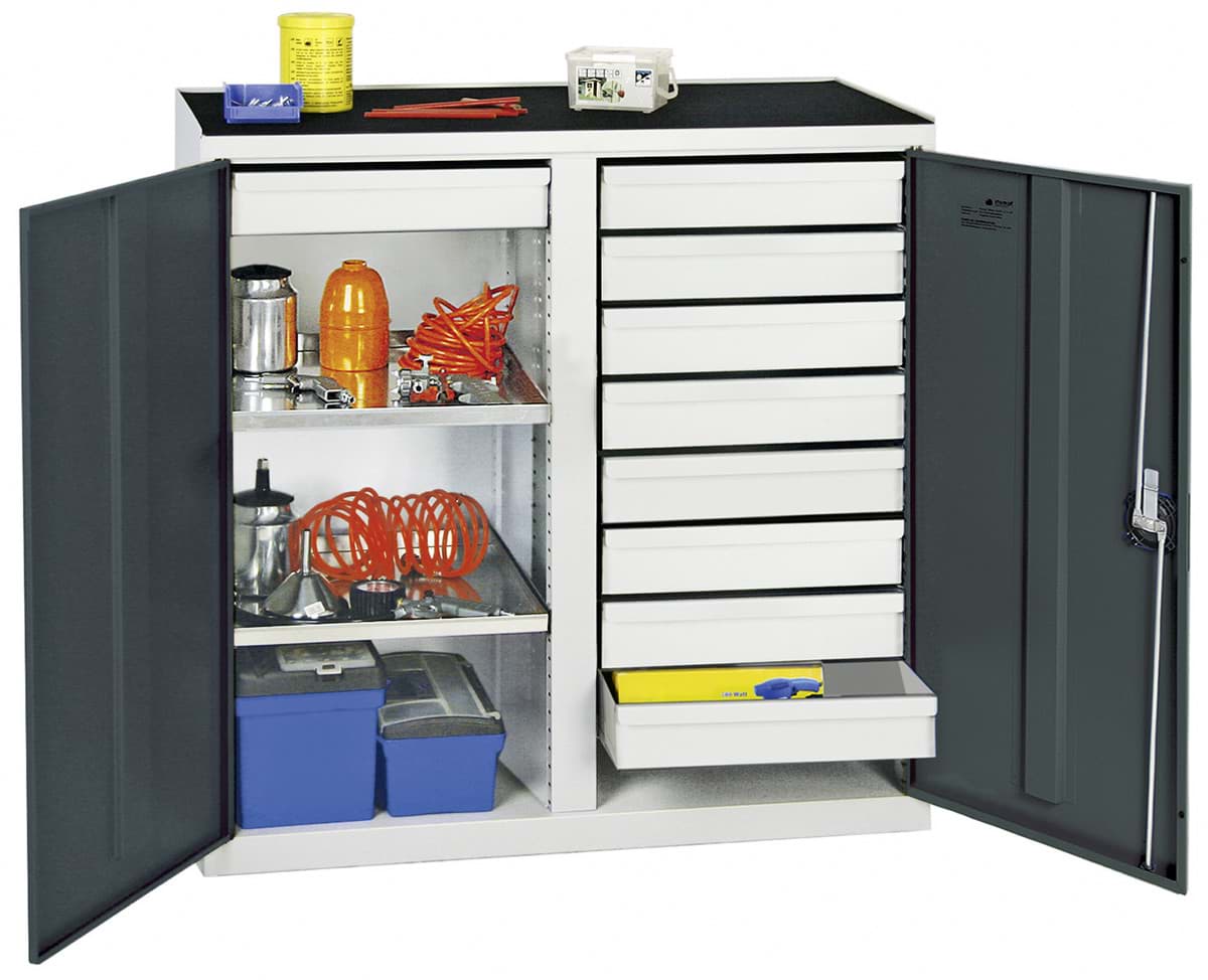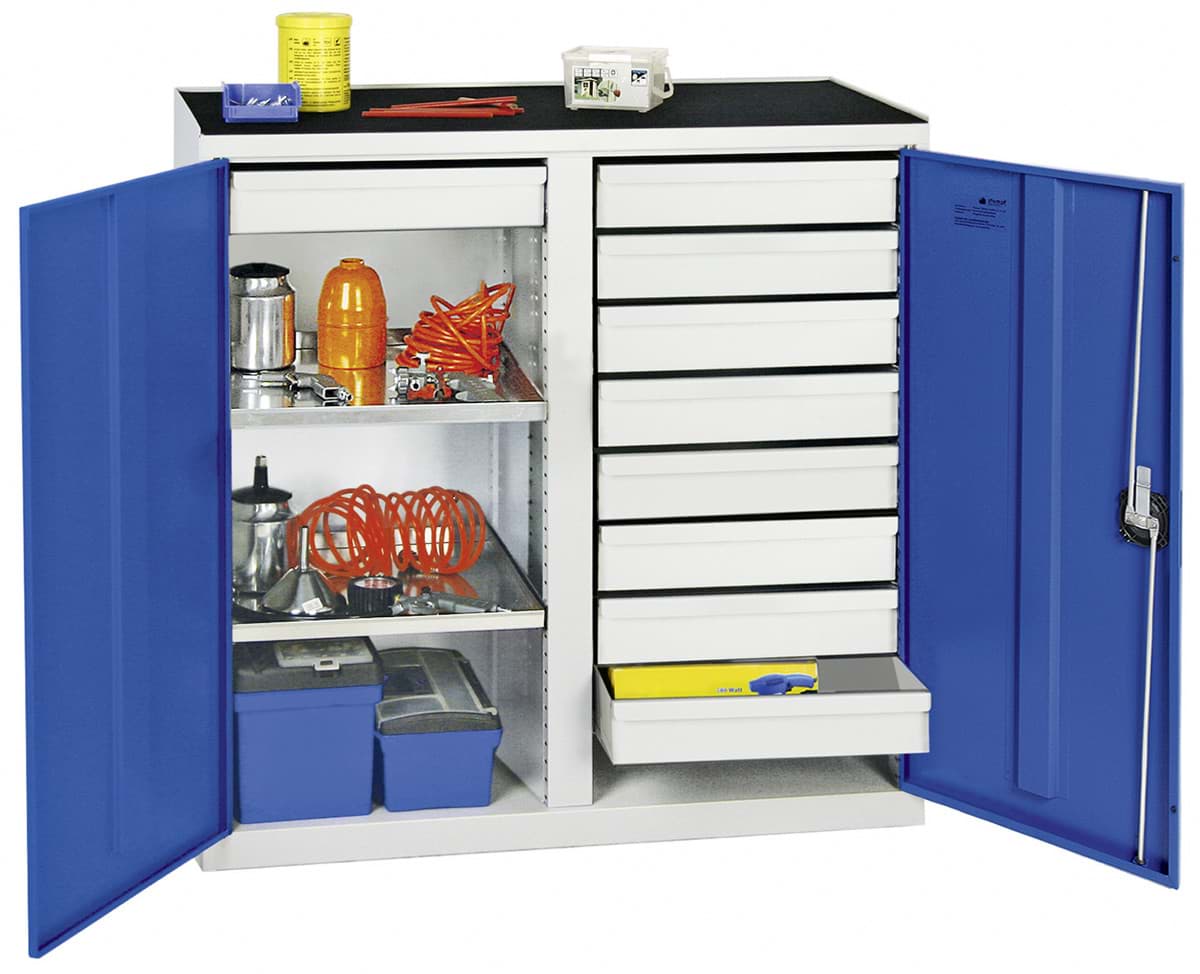 Werkstattschrank 1800 x 1000 x 500 mm HxBxT mit Trennwand und 14 Schubladen