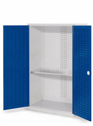 mit Lochplattentüren, 3 Fachböden, Türen RAL 5010 enzianblau, Korpus RAL 7035 lichtgrau, stabile Stahlblechkonstruktion, Rückwand mit Systemlochung, glatte Fronten, vorgebaute Türen mit Öffnungswinkel 200°, doppelwandig verstärkte Türen, verzinkte Fachböden mit Fachlast 80 kg, dreiriegeliges Sicherheitszylinderschloss, Hauptschlüsselfähig