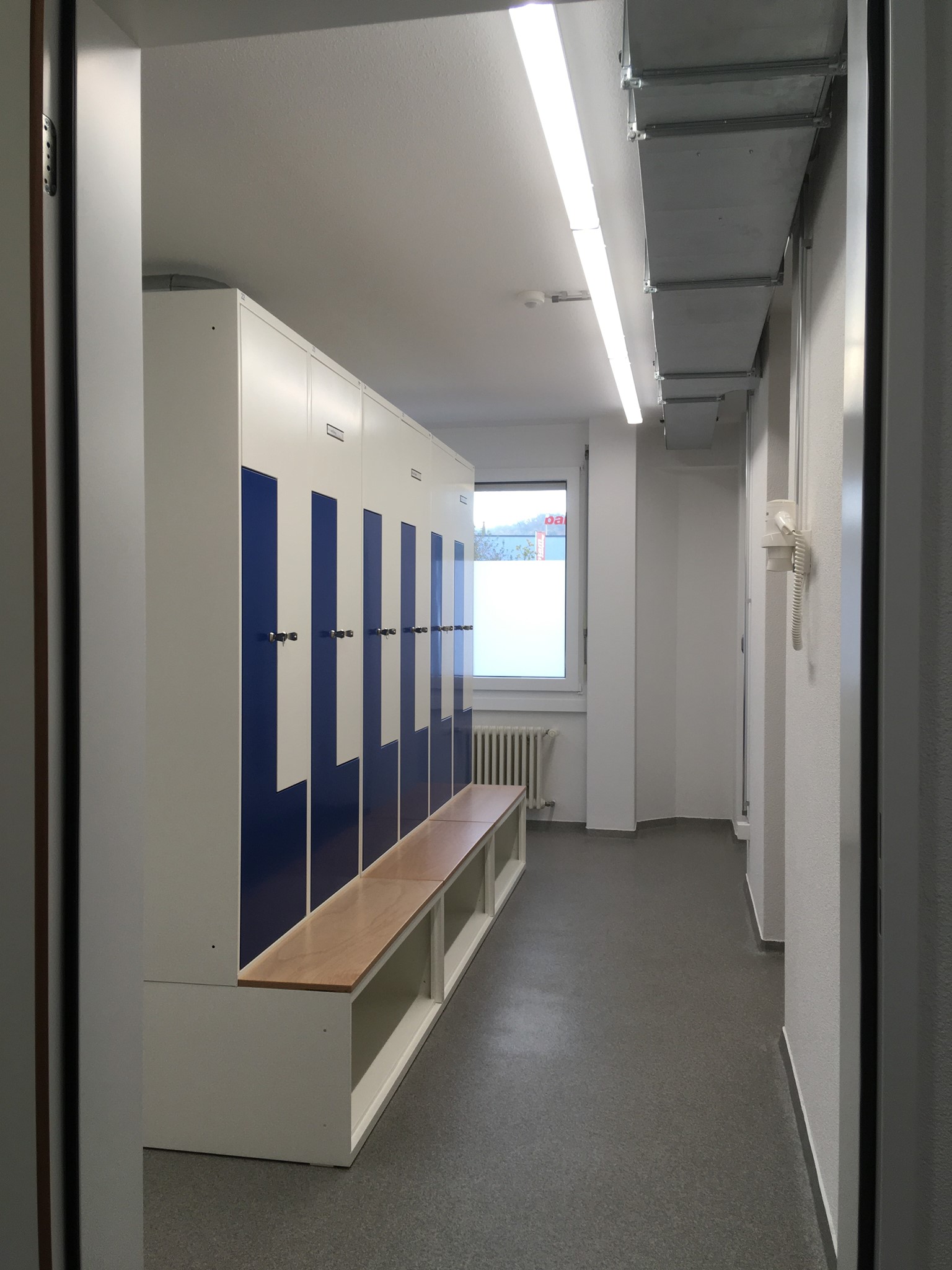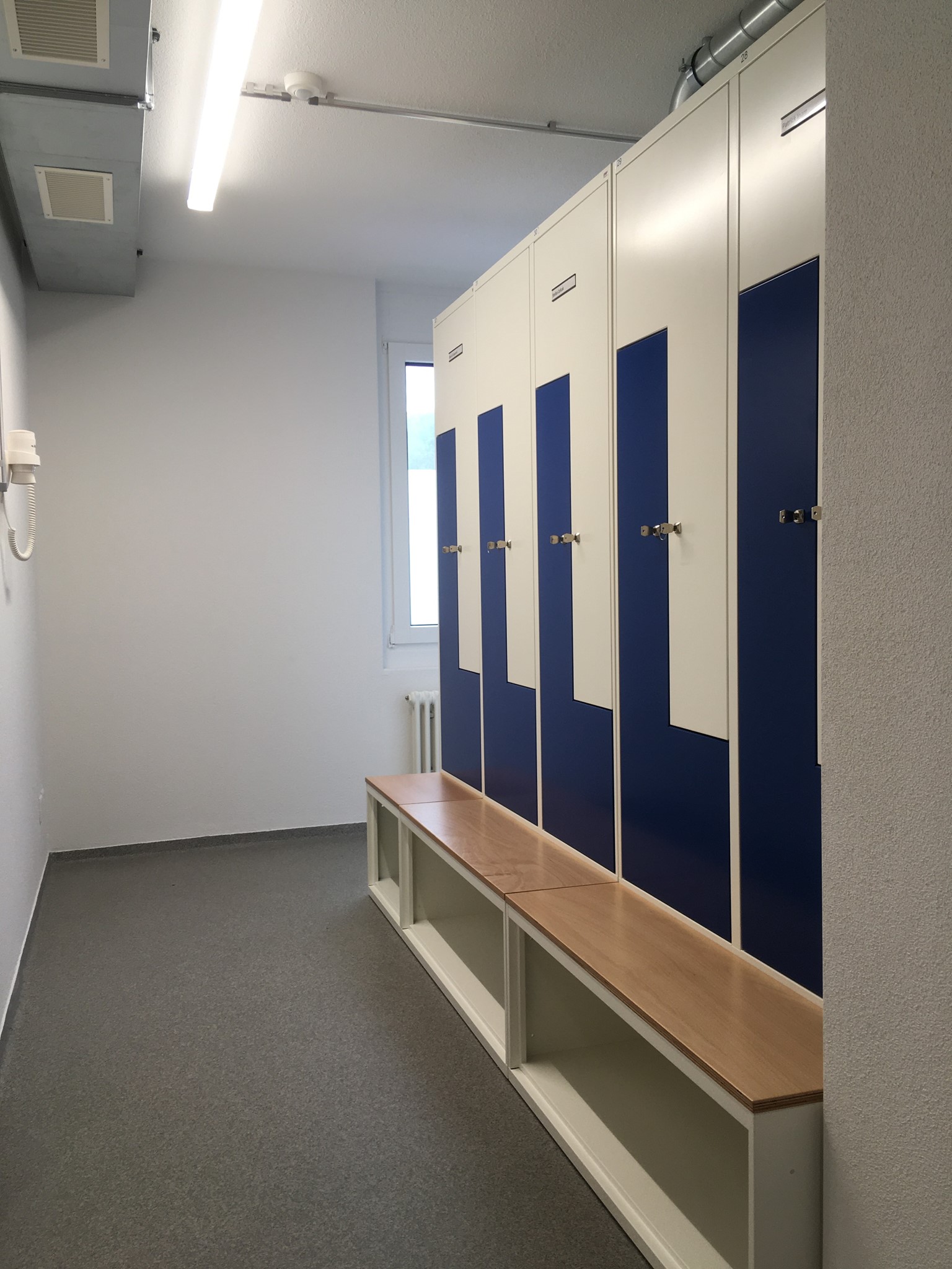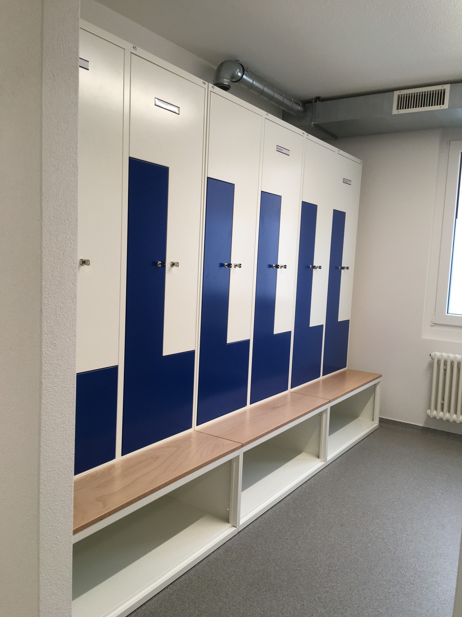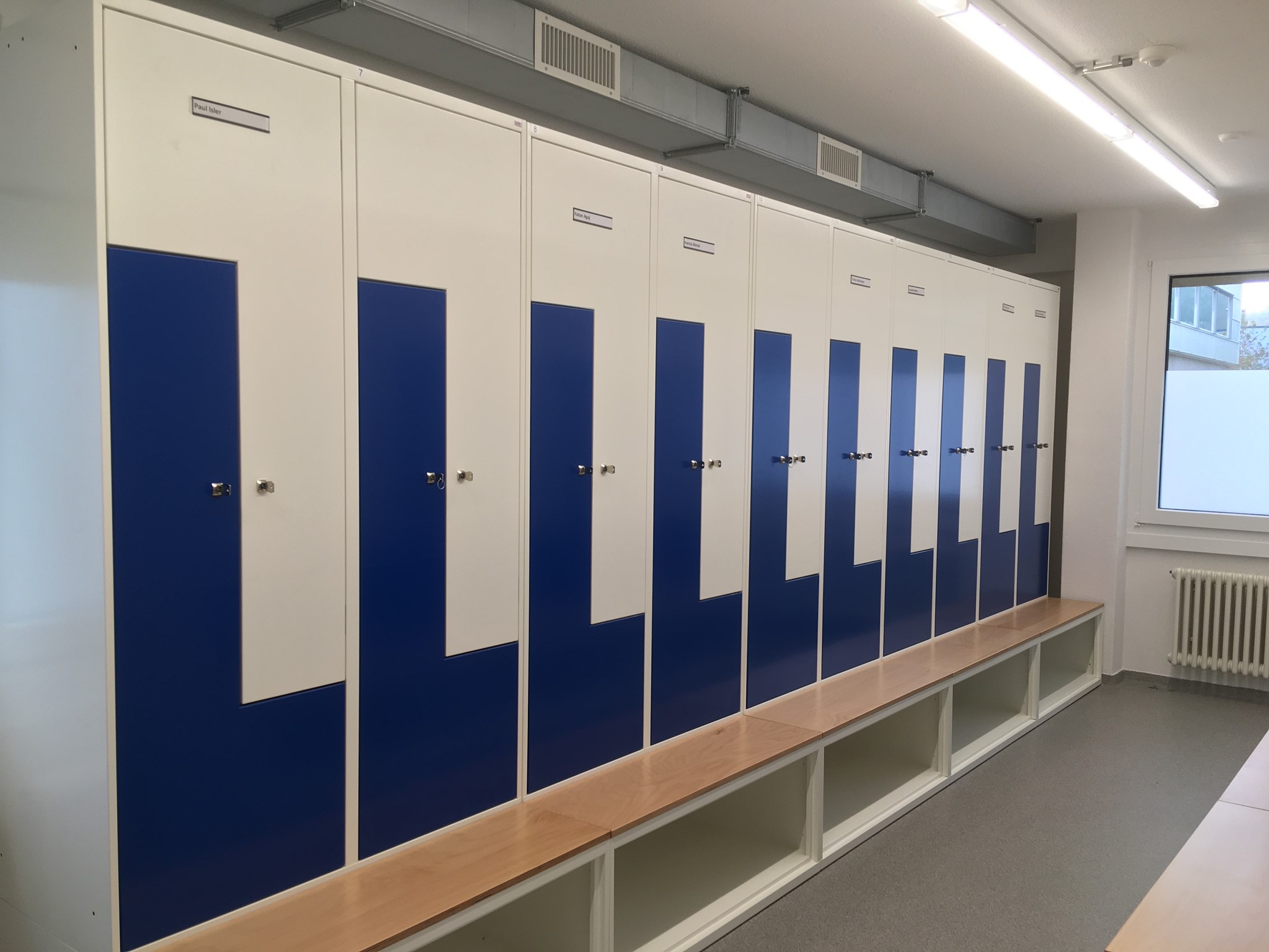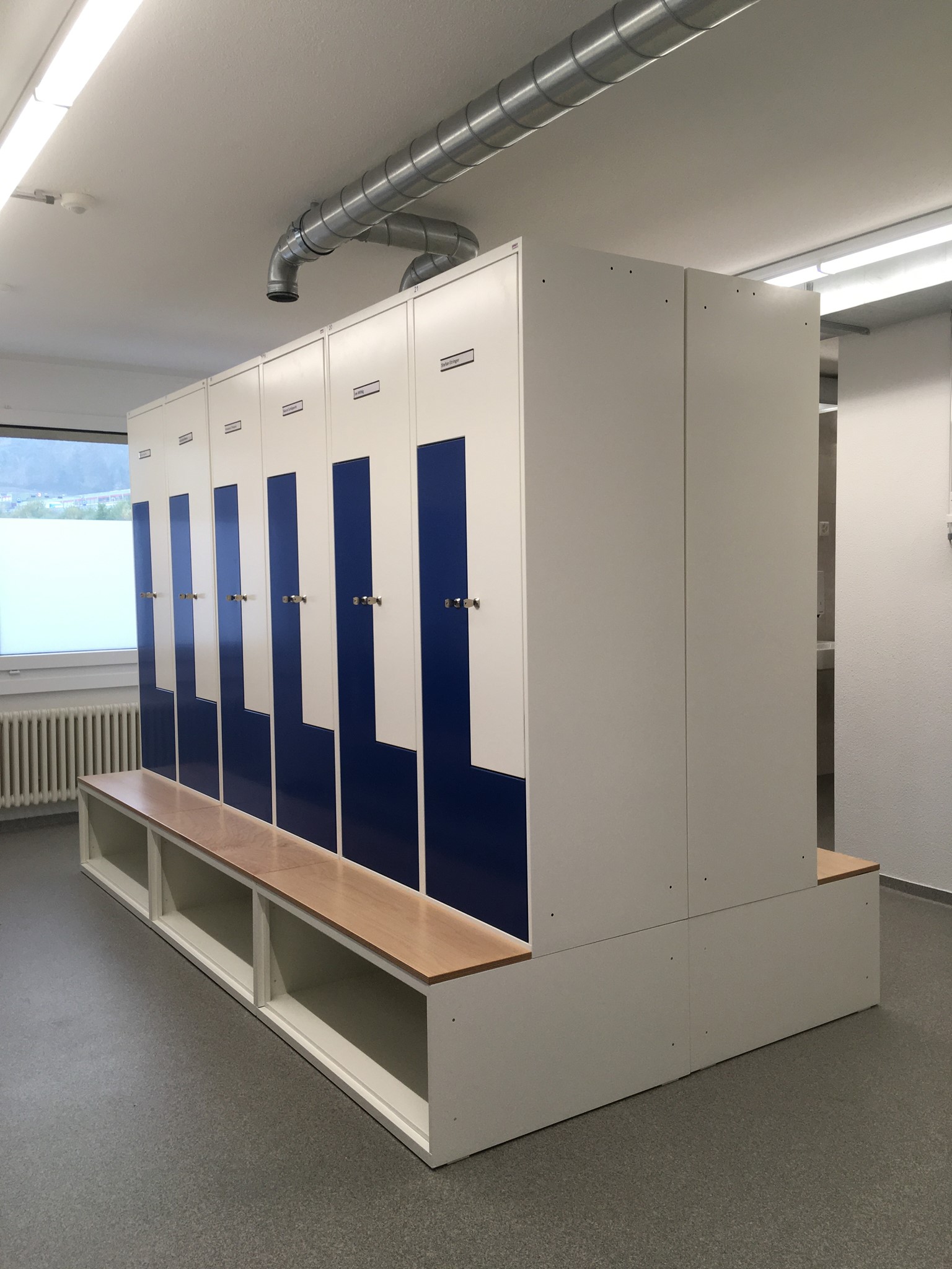 Die Mitarbeiter dieses Werkhofes freuen sich sicher über die neuen sehr schönen Garderobenschränke. Durch die Kombination mit untergebautem Schuhfach und Sitzbank und darüber ein Z-Schrank, hat jeder Mitarbeiter genügend Platz für seine Kleidung und Schuhe. Dank der Farbkombination wurden auch die Zürcher Farben perfekt wiedergegeben. Diese Anlage mit Top-Design wurde komplett mit Standardfarben und Schränken ohne Aufpreis realisiert.